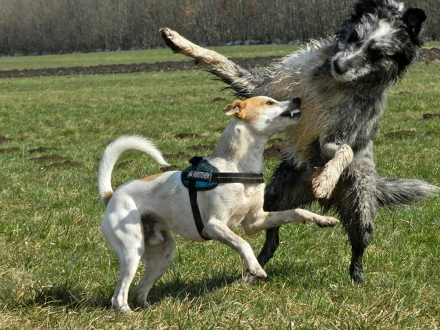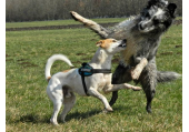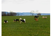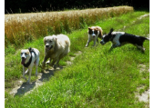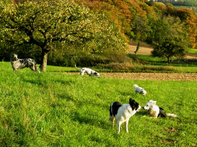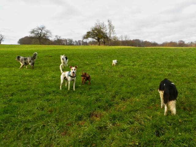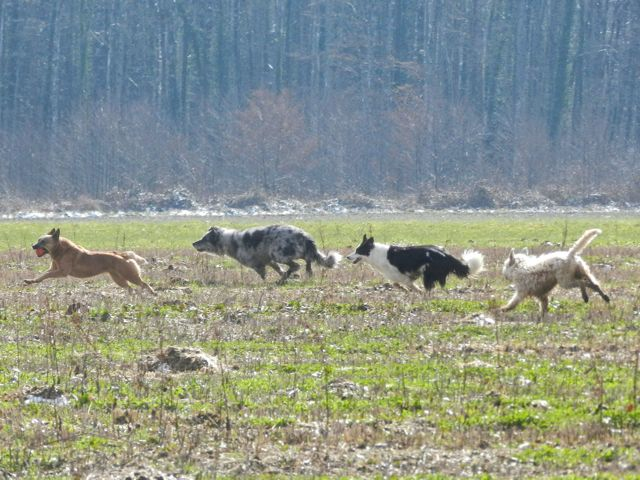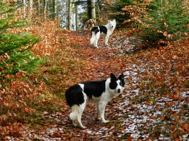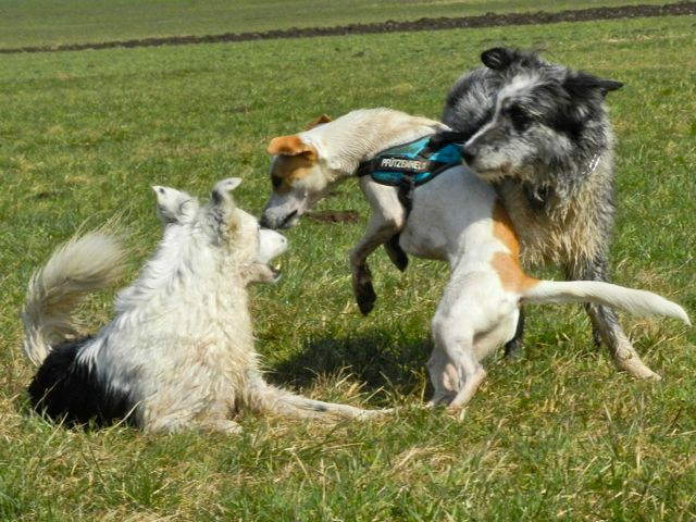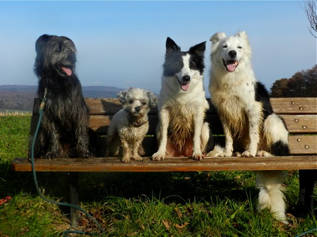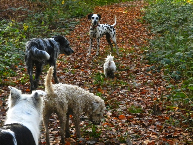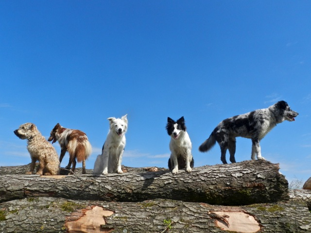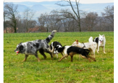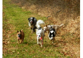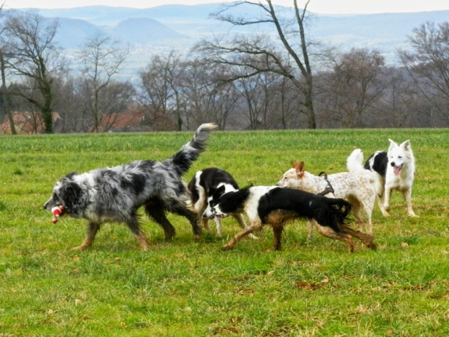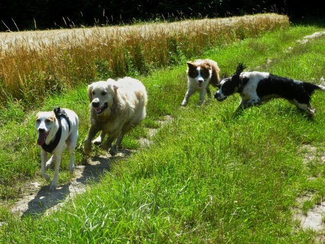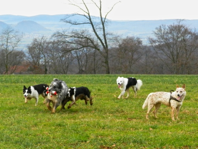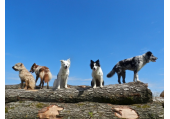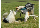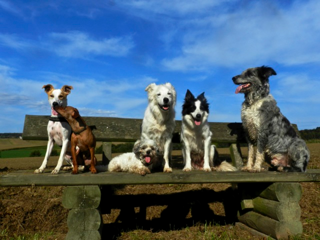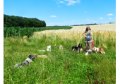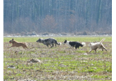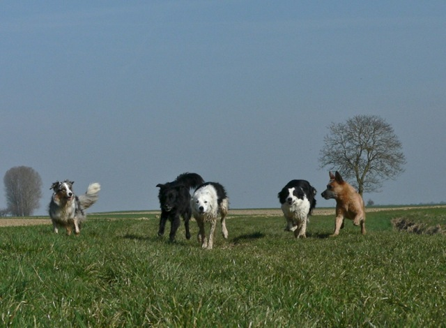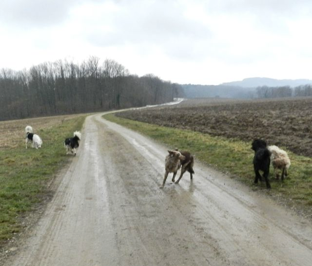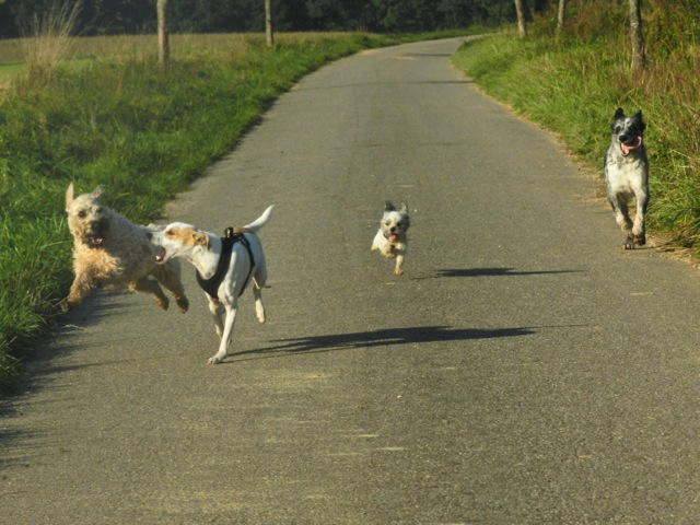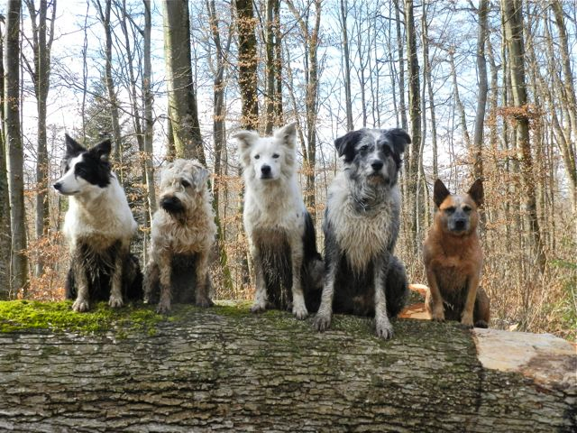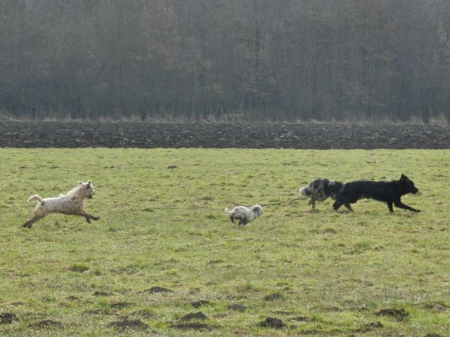 Meine Rudel bestehen meist aus 4-6 Hunden. In Einzelfällen habe ich auch mal 7 Hunde dabei, dann sind das aber immer Hunde, die ich sehr gut kenne und wo mindestens die Hälfte davon absolut verlässlich ist. Das Wichtigste für ein Rudel ist Ruhe. Und in meinen Rudeln herrscht die. Kommen neue Hunde rein, werden diese sorgfältig ausgesucht und so sind die Rudel grundsätzlich bei mir sehr harmonisch. Natürlich gibt es, gerade bei Junghunden, Spiel-/Renneinheiten. Aber immer wieder kehrt Ruhe ein. Zuverlässige Hunde dürfen frei laufen, in übersichtlichem Gelände leine ich auch mal alle ab, damit sie etwas toben können. Meist habe ich aber, gerade im Wald, 1-2 Hunde am Bauchgurt.