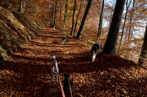 Da wieder ein Jäger, der eine blöde Klappe haben muss, weil ich mit so einem Rudel unterwegs bin (die Hunde aber alle friedlich bei mir sind), da wieder ein Biker, der von hinten den Weg runtergebrettet kommt und mitten durchs Rudel rast. Danach ein freilaufender Hund, weit und breit kein Mensch zu sehen. Dann wieder ein Kamikazienwildschwein, welches 10 meter vor uns aus dem Unterholz geschossen kommt. Auch mit dem ganzen Rudel in eine herbstliche Treibjagd hinein zu geraten ist nicht soooo entspannend. :-)