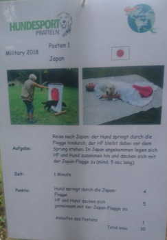Und weiter ging es nach China. Wir dachten schon, wir müssen die Chinesische Mauer überwinden, so lange mussten wir hier warten. Nachdem wir beinahe eine halbe Stunde im Regen standen, vergass ich dann, das Aufgabenblatt zu fotografieren. Es standen 3 Hocker auf dem Boden mit jeweils einem kleinen Schälchen darauf und einer Fussmatte daneben. Im ersten Schälchen lagen drei Hundekekse, welche man mit chinesischen Essstäbchen ins nächste Schälchen transportieren musste und von dort ins dritte. Der Hund sollte in der Zwischenzeit auf den Fussmatten einmal liegen, einmal sitzen und einmal stehen.