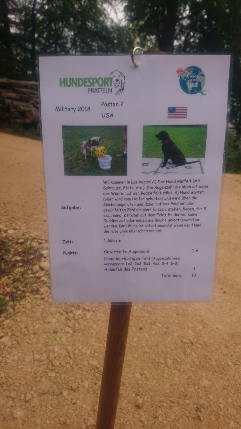 Flaggen, Länder, Umrisse,… die Panik verbreitete sich schlagartig und wir schienen nicht die einzigen zu sein, bei denen sich der Regen auf der Stirn mit Schweiss vermischte. Aus unerklärlichen Gründen entstand bei diesem Posten zu unserem Glück ein kleiner Stau, sodass wir unsere Bildungslücken mithilfe von Google zu füllen versuchten. Es half zwar nicht viel, aber immerhin verkürzte es uns die Wartezeit etwas und wir konnten am Ende doch die ein oder andere Flagge richtig zuordnen (Nein, das war gaaaanz bestimmt kein Glück, sondern fundiertes Wissen). Die Hunde waren bei ihrer Aufgabe etwas kompetenter unterwegs und Danae bekam dabei von der Postenbetreuerin freundlicherweise noch ganz viele Tips, wie sie Nupri richtig zu führen hat.