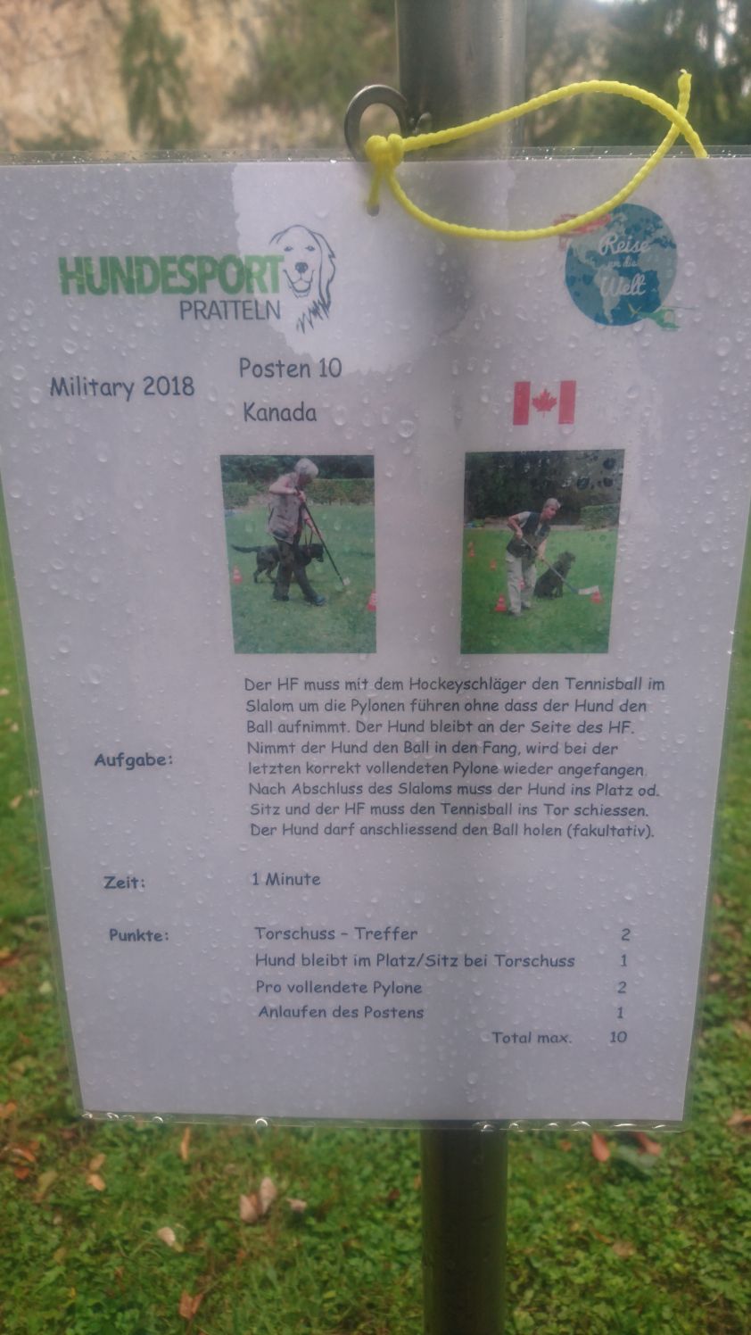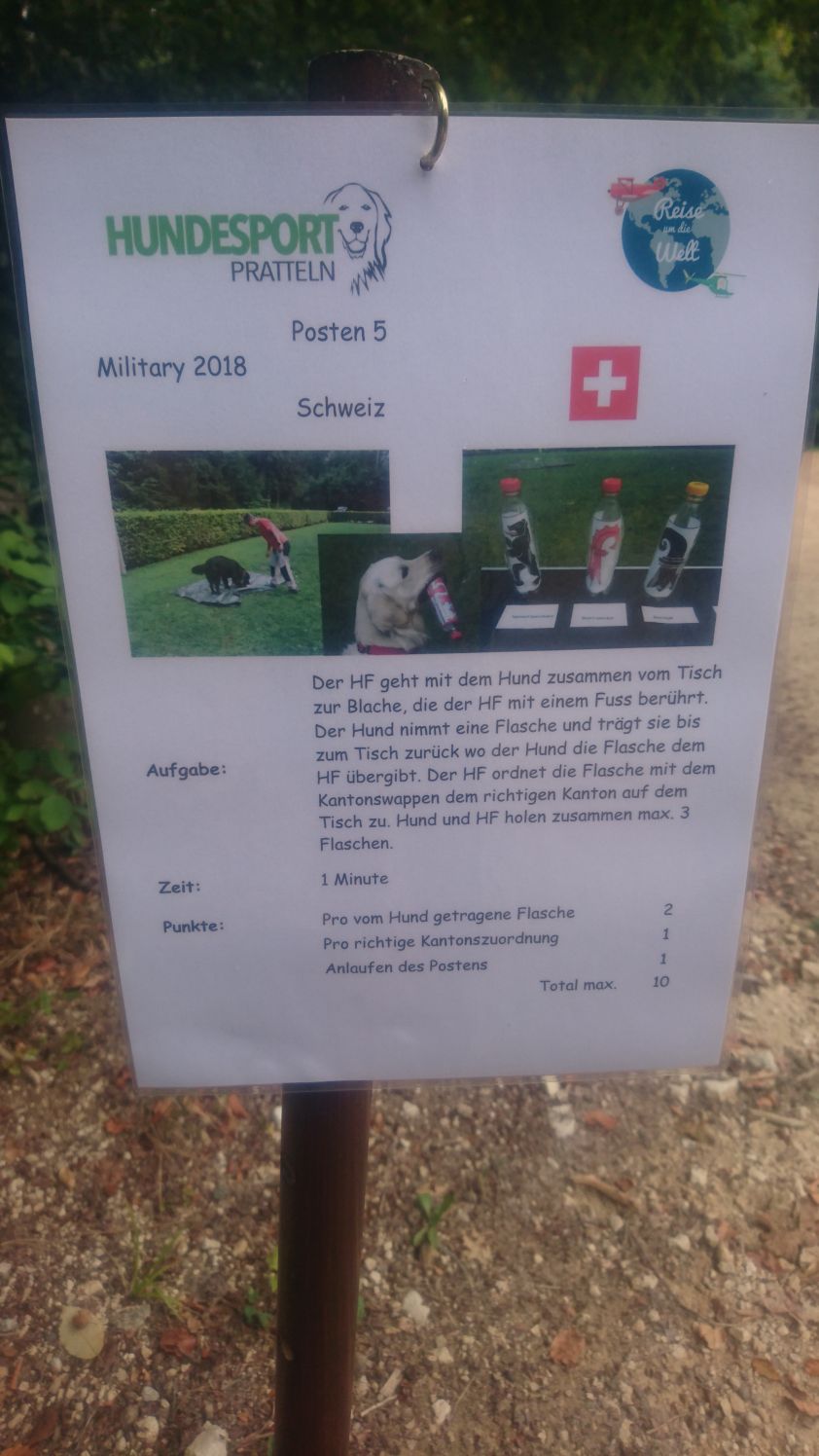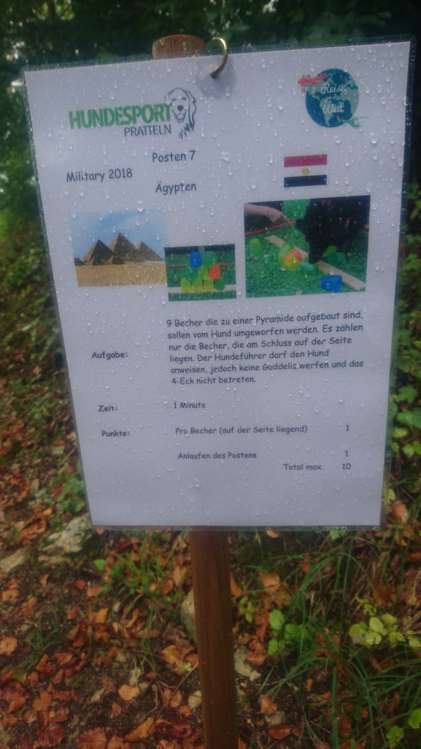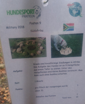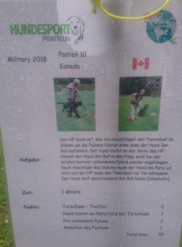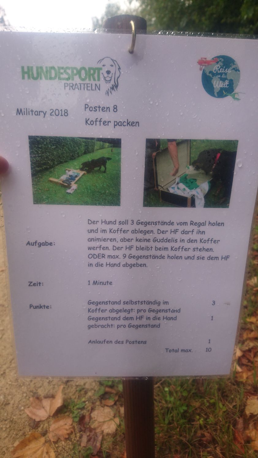 Und dann ging es weiter zum Koffer packen. Ein typischer Apportierposten, wobei auch hier die Anweisungen wieder etwas schwammig waren. So durfte der Hund die Gegenstände auch neben den Koffer legen… Ab welcher Distanz zum Koffer es dann keine Punkte mehr gibt, war uns nicht ganz ersichtlich. Ausserdem war ich froh, habe ich einen einigermassen grossen Hund, da die zu apportierenden Gegenstände alle ziemlich gross waren und vom Regen schon total vollgesogen und entsprechend schwer. Trotz allem ein guter Posten, mit etwas Verbesserungspotential bei der Planung.