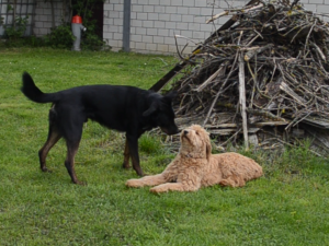 So stellten wir ihm dann nach der Theorie (wo wir nochmals im Detail die einzelnen Rollen im Rudel, ihre Aufgaben und Fährigkeiten durchgingen) gleich mal eine nette Hündin vor. Malu, eine junge Labradoodle Dame. Wuslig und flink doch sehr sanft und fein zu arbeiten.
