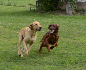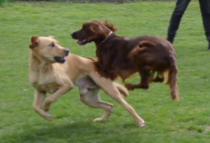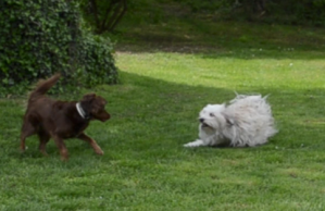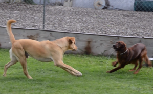 Rammen, ausbremsen, aufeinander und übereinander springen, keinerlei körperliche Hemmungen. Da prallt die Wucht zweier Hunde von je (geschätzt) zwischen 25-35 kg aufeinander...