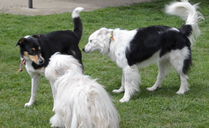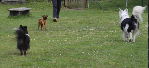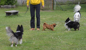Nun kommt nochmal ein introvertierter Wächter hinzu. Und wie das so ist mit den Wächtern: beide kläffen sich mal an, beide versuchen sich mit Imponiergehabe und Scheinangriffen zu beeindrucken. Hier war nun allerdings Nupri noch dabei, der die Leitung übernahm und sehr einladend auf Tosca zumarschierte. Jo-Joy, der Sheltie-Wächter, arbeitet hier bereits mit Nupri zusammen.