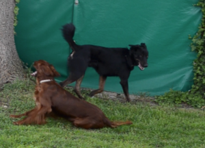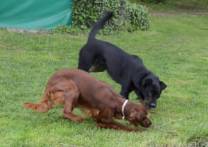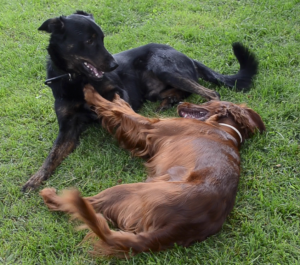 Lea und Lemmy am kabbeln am Boden, sehr wild, sehr körperlich, wie extrovertierte halt sind. Aber: Lea kam nach und nach wirklich zur Ruhe. Saubere Arbeit, Lemmy! Wenn man auch noch bedenkt, dass ja sonst eigentlich der vordere Leithund der direkte Entscheidungsträger (und Ruhepol) des vorderen Kundschafters ist.